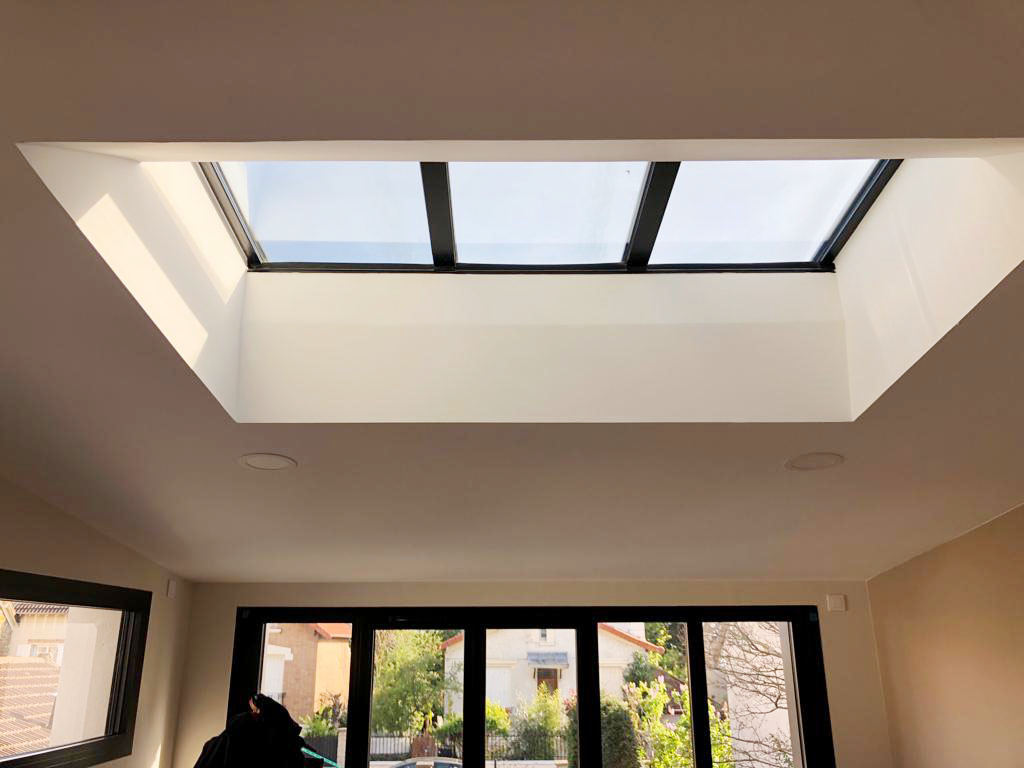 Cette extension contemporaine est soulignée par des menuiseries en aluminium aux mêmes tonalités que le zinc prépatiné noir. Nous avons posé une verrière fixe dans le but d’apporter un puit de lumière dans ce nouvel espace de vie.