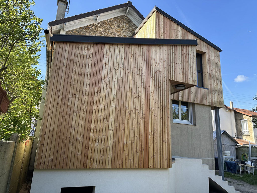 L’ossature et le bardage en bois sont des éléments clés de cette extension. Le bois, matériau naturel par excellence, apporte un aspect chaleureux au premier regard. En plus de son aspect esthétique, le bardage en bois contribue également à l’isolation thermique et acoustique du pavillon, améliorant ainsi le confort de ses occupants.