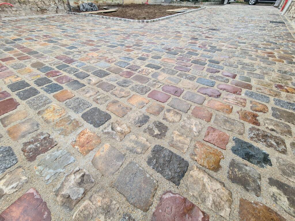Avant toute pose, il est nécessaire de régler et compacter le fond de forme ; ceci permet de s’assurer que la surface sera bien plane et qu’elle supportera la charge des pavés sans aucun problème. Vient ensuite la pose des bordures en grès ancien. Puis celle des pavés de récupération eux aussi en grès ancien.