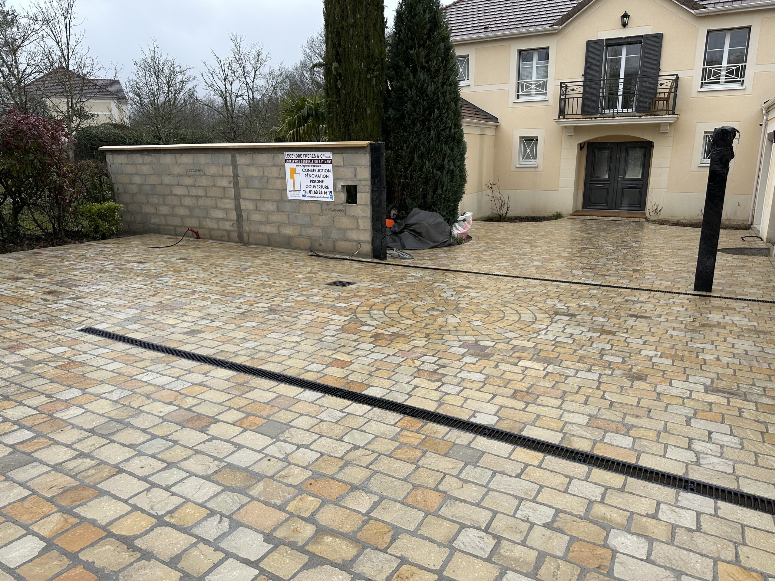 Un bon aménagement extérieur doit aussi assurer une évacuation efficace des eaux. Pour cela, nous avons installé des caniveaux en fonte, permettant de drainer l’eau de manière optimale et d’éviter toute accumulation en surface.