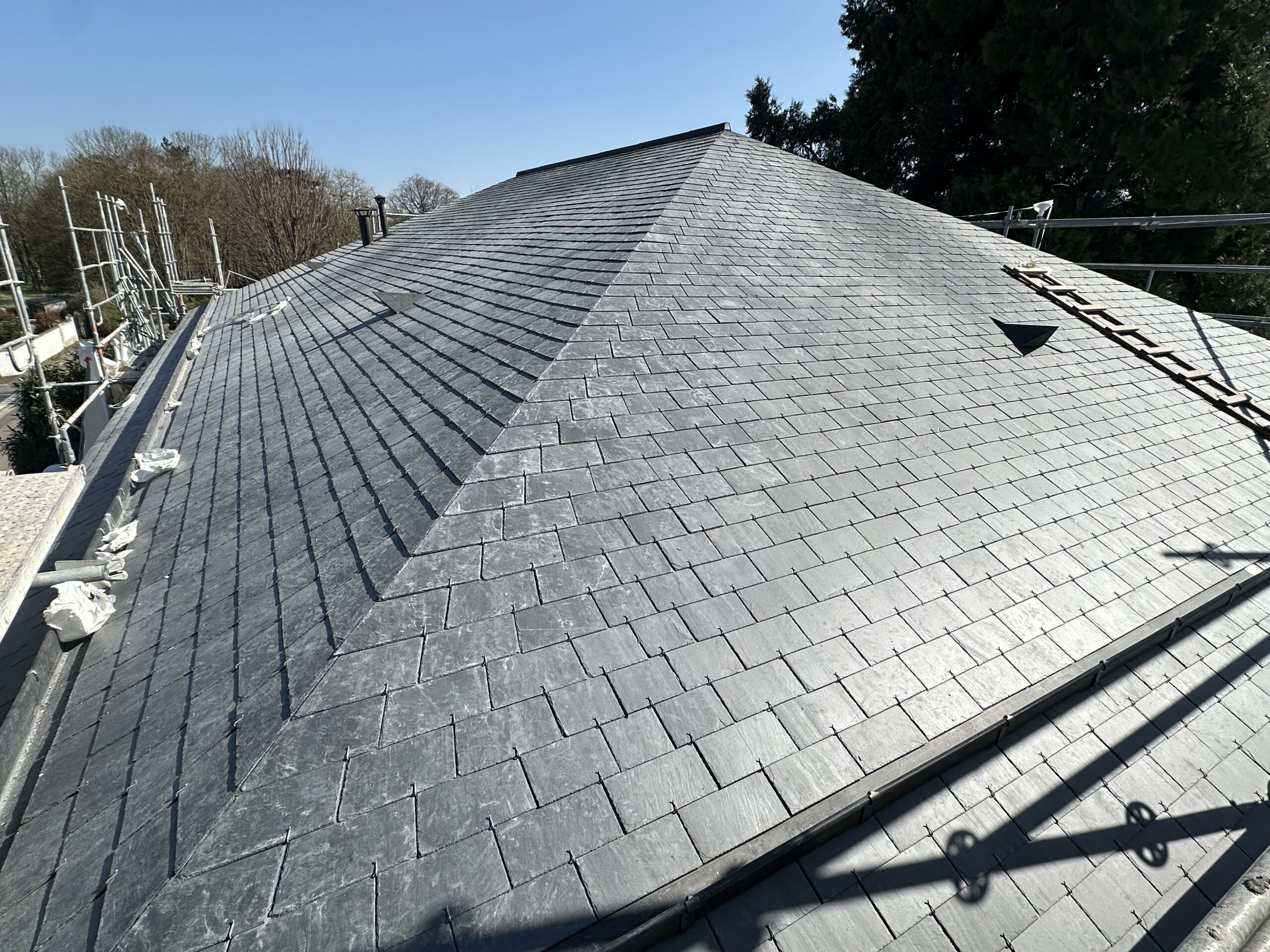 La nouvelle toiture a été réalisée en ardoises d’Espagne Excellence, au format 32×22 cm. Ce matériau haut de gamme est apprécié pour sa longévité, son rendu visuel régulier et sa résistance aux intempéries. C’est un choix sûr pour une couverture esthétique et durable, en parfaite harmonie avec l’ensemble du bâtiment.