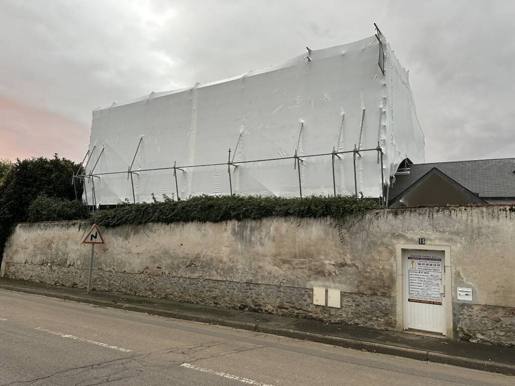 - Installation d’un échafaudage complet : un échafaudage avec un bâchage de type paraluie a été mis en place afin de protéger le chantier des intempéries. Cette précaution est essentielle pour garantir la sécurité des ouvriers et la qualité des travaux.
