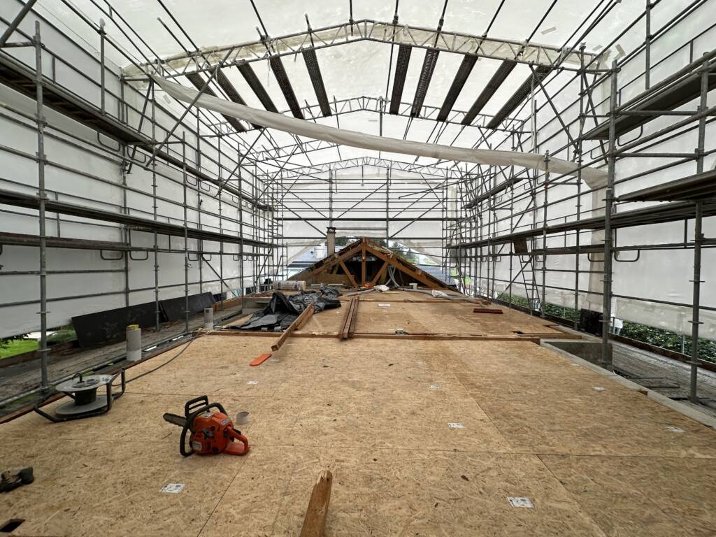 - Découverture complète de la toiture : la couverture existante a été entièrement retirée pour laisser place aux futures modifications.