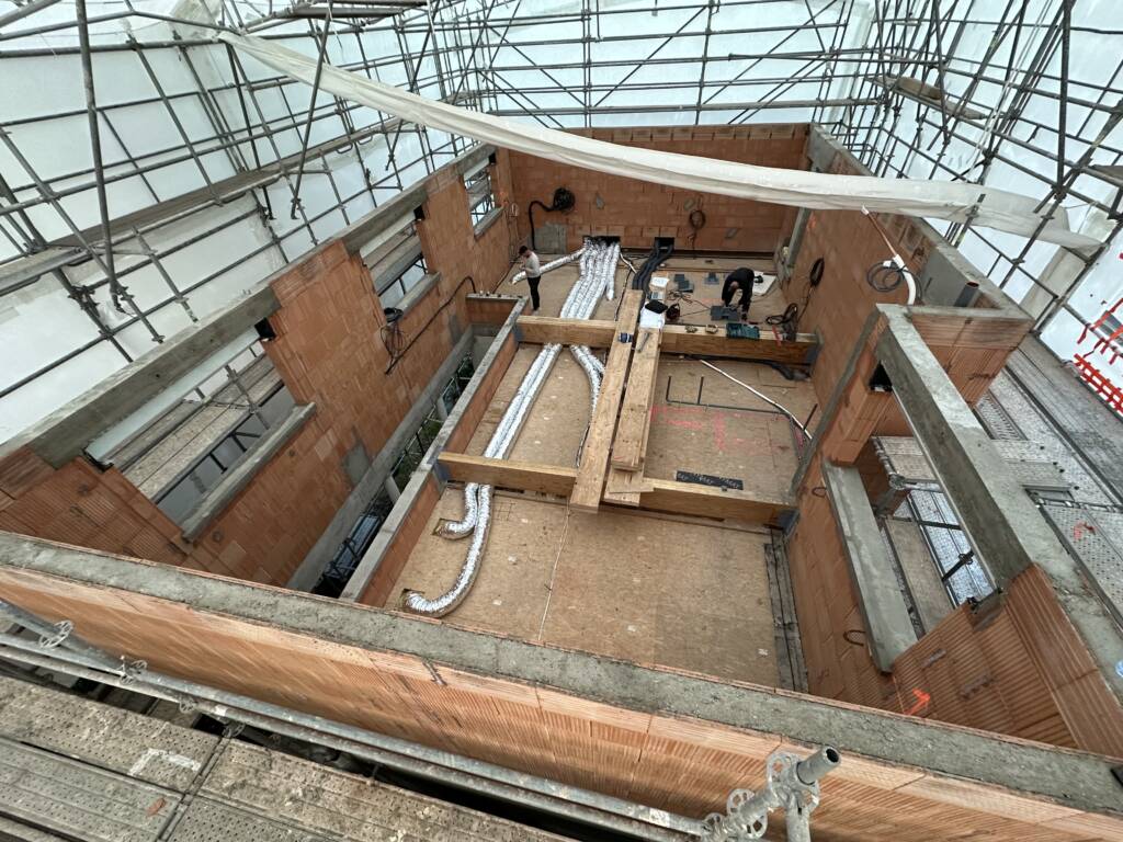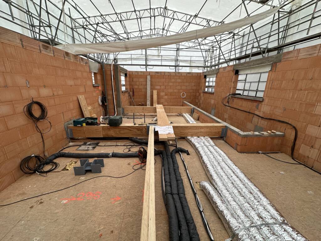 Le chantier continue avec la mise en place des éléments structurels et esthétiques qui donneront une nouvelle vie au pavillon.