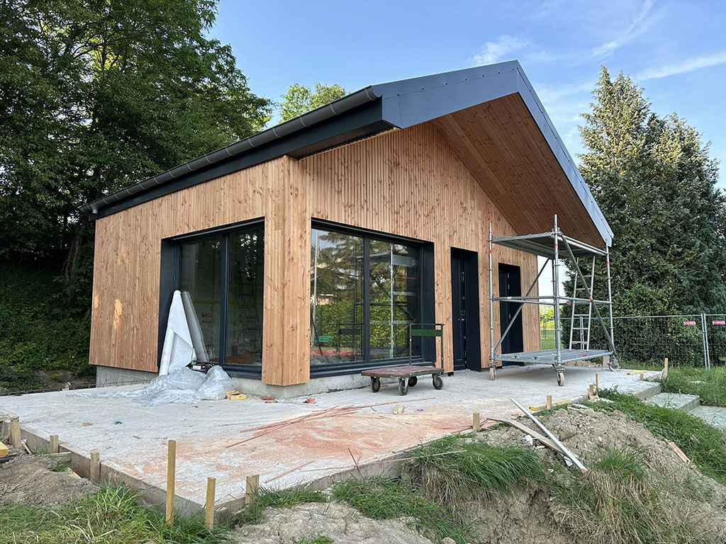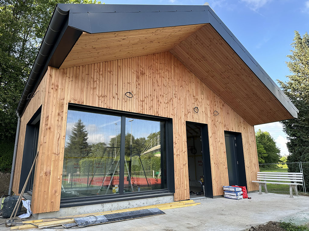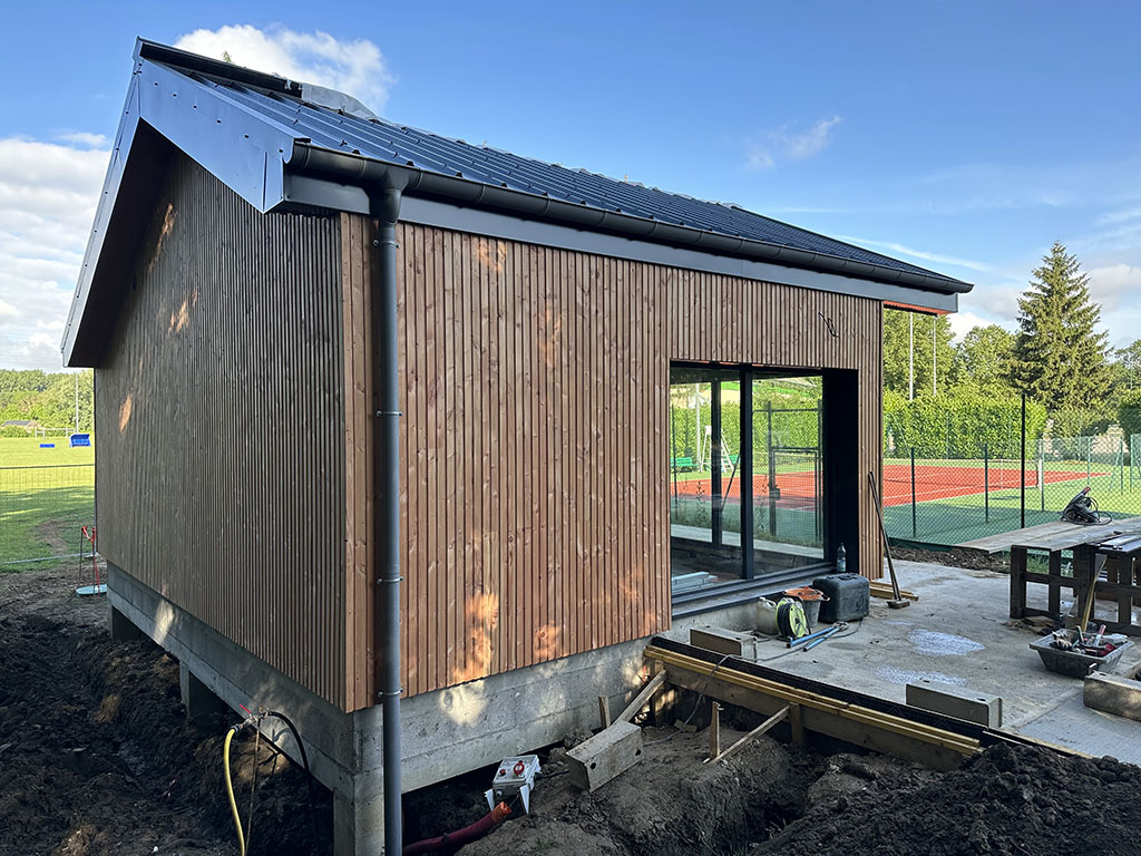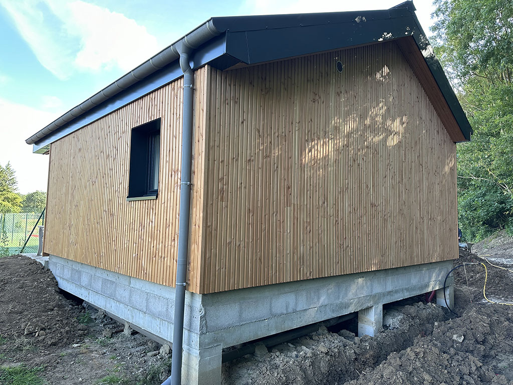 L’infrastructure du nouveau vestiaire repose sur une base en béton solide, garantissant la stabilité et la durabilité de la structure. Le choix du béton permet non seulement une résistance accrue aux intempéries et à l’usure, mais offre également une isolation efficace grâce à un plancher isolant intégré. Cette caractéristique est essentielle pour maintenir une température agréable à l’intérieur du vestiaire tout au long de l’année, réduisant ainsi les besoins énergétiques pour le chauffage et la climatisation.