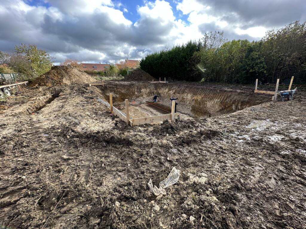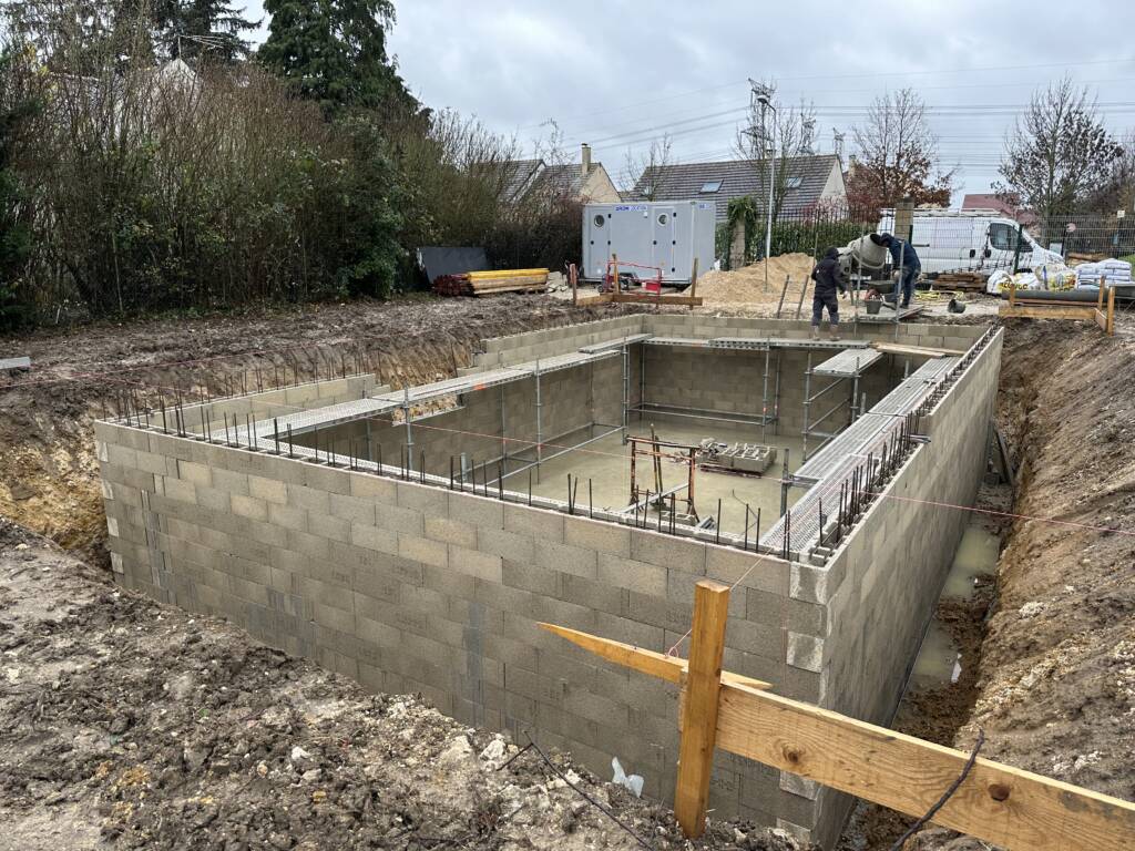 Les fondations : notre aventure a commencé avec la création d’un sous-sol enterré, robuste et sécurisé, construit en blocs à bancher, garantissant solidité et durabilité. 🏗️