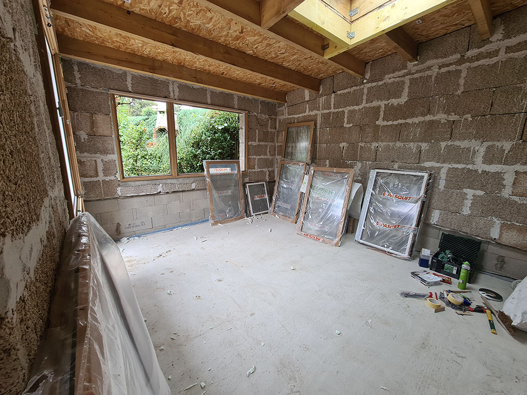 Dans le cas présent, nous avons monté une extension avec des murs en briques de chanvre. Pour harmoniser l’ensemble et rester dans une cohérence écologique, les propriétaires ont choisi d’installer des fenêtres en bois et ont opté pour une toiture végétalisée. Le résultat sera du plus bel effet !